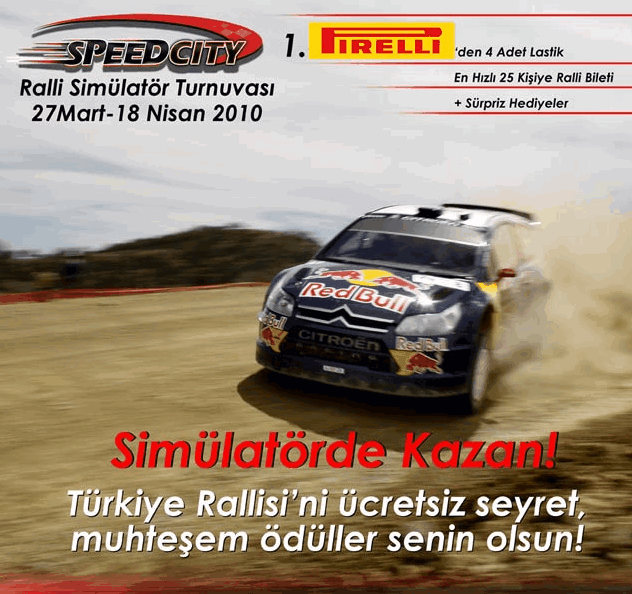 Dostumuz SpeedCity, “Ralli Simülatör Turnuvası” düzenliyor. 18 Nisan’a kadar sürecek turnuvada, gerçek Ralli aracında Colin Mcrae Rally oyunu oynayarak turnuvaya katılabileceksiniz. Turnuvada en iyi 25 kişi Dünya Ralli Şampiyonası’nın İstanbul ayağını seyretmek için kombine bilet, en iyi dereceyi yapan yarışmacı da Pirelli’den 4 adet lastik ve süpriz hediyeler kazanacak.
