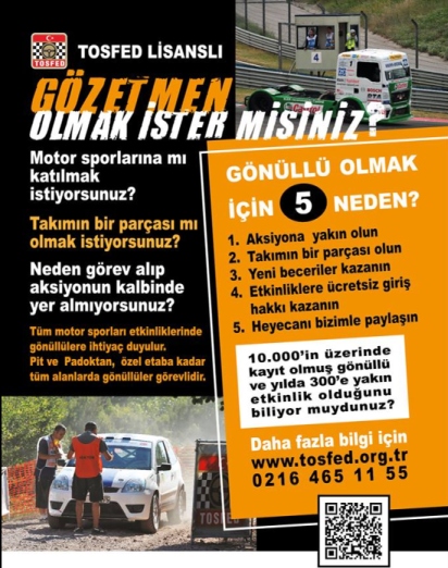 TOSFED lisanslı gözetmeni olarak, bir yılda dokuz ayrı branşta organize edilen yaklaşık 100 Türkiye Şampiyonası ve mahalli şampiyona yarışlarının yanı sıra Kamyon Yarışları, Dünya Rallikros Şampiyonası ve Avrupa Ralli Kupası gibi dev uluslararası organizasyonlarda, resmi bir görev almak için ilk adımı atmak istiyorsanız, tek yapmanız gereken, ücretsiz olarak düzenlenen Yeni Gözetmen Eğitim Seminerlerine katılmak. Ayrıca bizlerle tanışmak, organizasyonlarımız hakkında detaylı bilgi almak, aramıza katılmak isterseniz de biz de seminerde yanınızda olacağız.