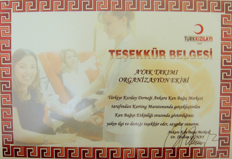 5 Aralık 2009’da düzenlemiş olduğumuz Üniversiteler Arası Karting Maratonunda, Türk Kızılayı yetkililerinden teşekkür belgesi aldık. Bugüne kadar organizasyonlarımızda ekibimiz ve üyelerimiz birçok kez kan bağışında bulundu. Türk Kızılayı’na biz de çok teşekkür ediyoruz. Gelecekte de desteklerimiz büyüyerek devam edecektir.