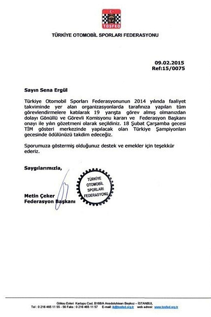 AGK – Ankara Gözetmen Kurulu’na bağlı, ayrıca ekibimizin başarılı gözetmenlerinden Sena ERGÜL; Türkiye Otomobil Sporları Federasyonu (TOSFED), Gönüllü ve Görevli Komisyonu tarafından Federasyon Başkanı onayı ile ‘Yılın Gözetmeni’ olarak seçilmiştir.